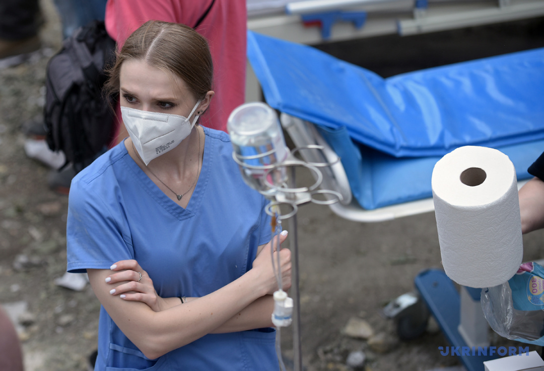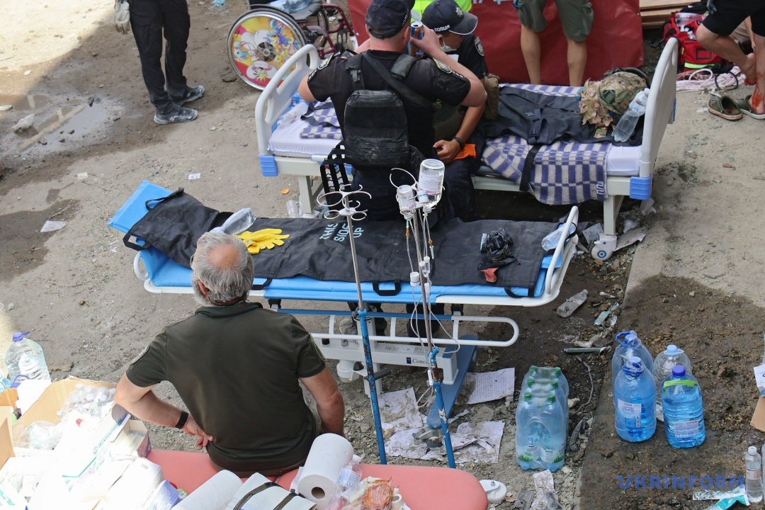 На місці розбирання завалів, до якого після перших хвилин влучання долучалися і небайдужі цивільні, працює важка інженерна техніка, тривають пошуково-рятувальні роботи.