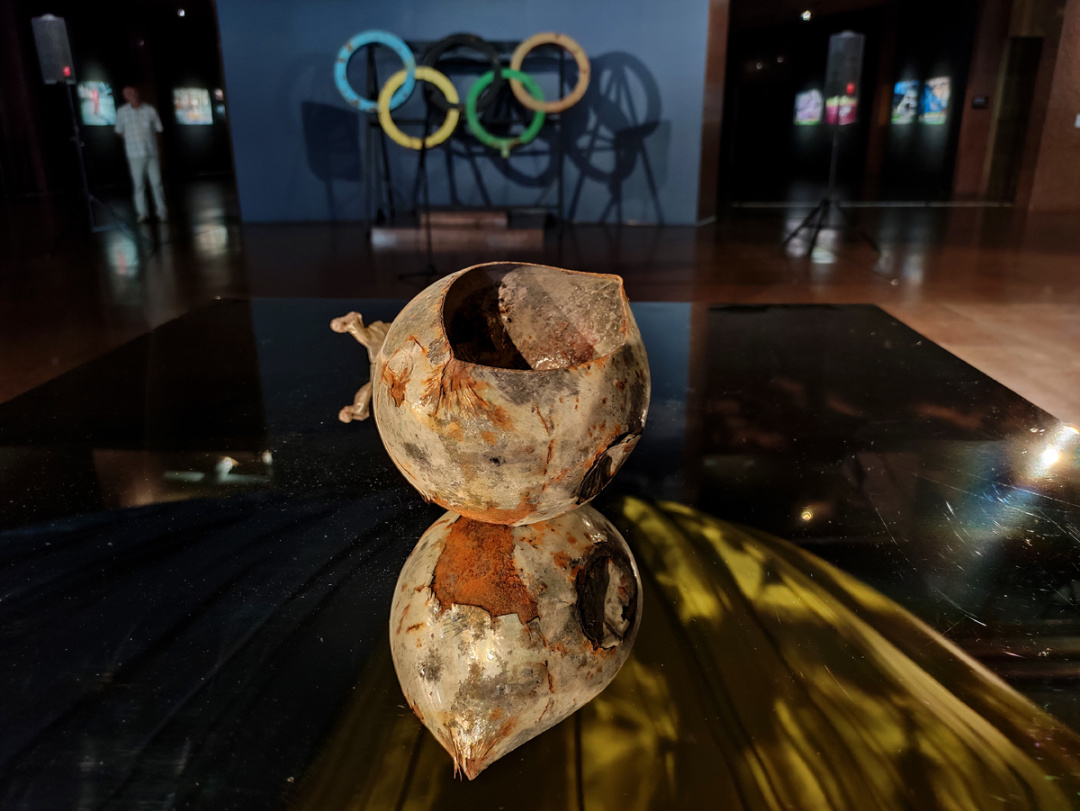 Пошкоджені, розбиті, оплавлені фрагменти нагородних кубків, які зібрали на зруйнованих внаслідок бойових дій та терористичних атак російської армії спортивних локаціях і представили на виставці "Воля до перемоги. Воїни спорту", присвяченій участі України в Олімпійських іграх у Парижі, під час її презентації у Національному музеї історії України у Другій світовій війні, Київ, 22 липня 2024 року.