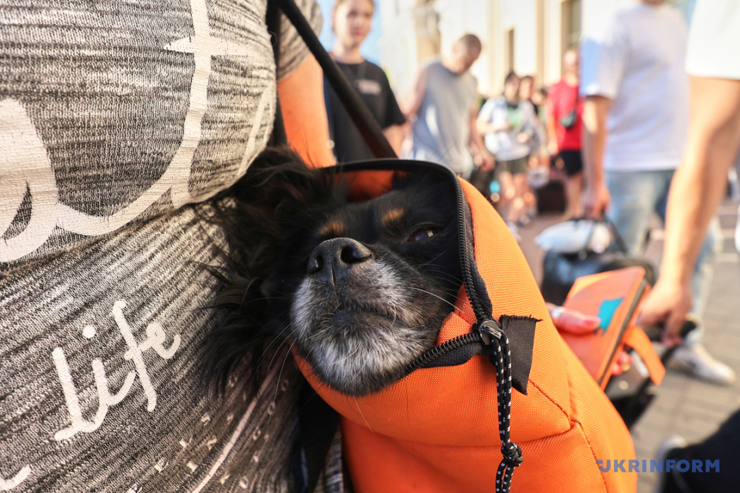 Собака у сумці під час відправлення понад 30 дітей з Куп’янського, Чугуївського та Ізюмського районів Харківської області на відпочинок до Хорватії, Харків, 20 липня 2024 року.