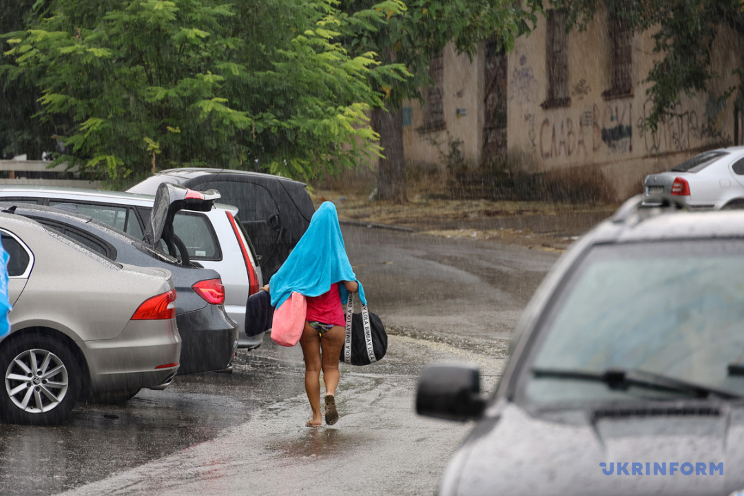 Відпочивальниця з рушником на голові залишає пляж через зливу, Одеса, 22 липня 2024 року.