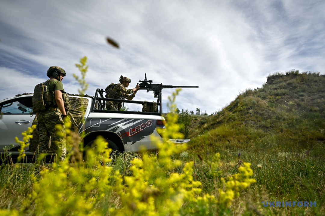Бійці Окремого зенітно-кулеметного батальйону, який виконує повітряне прикриття наших безпілотних об’єктів та знищує цілі на відстані до півтори тисячі метрів, під час відпрацювання практичної стрільби з великокаліберного кулемета Browning, Запорізька область, 10 липня 2024 року.
