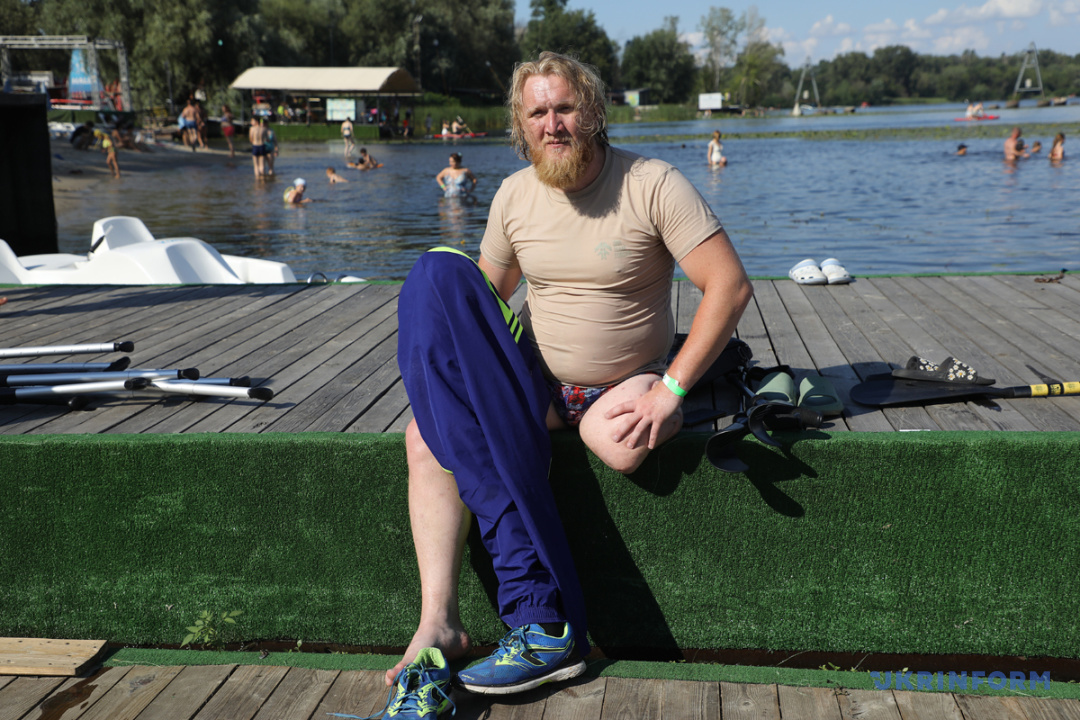 Ветеран російсько-української війни Віталій Колесников під час "Ветеранського пікніка" на березі Дніпра, організованого Благодійним фондом "Східна Зірка" за підтримки Міжнародного фонду "Відродження" та у партнерстві з ІМАТЕХ МЕДІКАЛ, БФ "Після служби" та реабілітаційним центром NEXT STEP, на території спортивного комплексу X-Park, Київ, 19 липня 2024 року.
