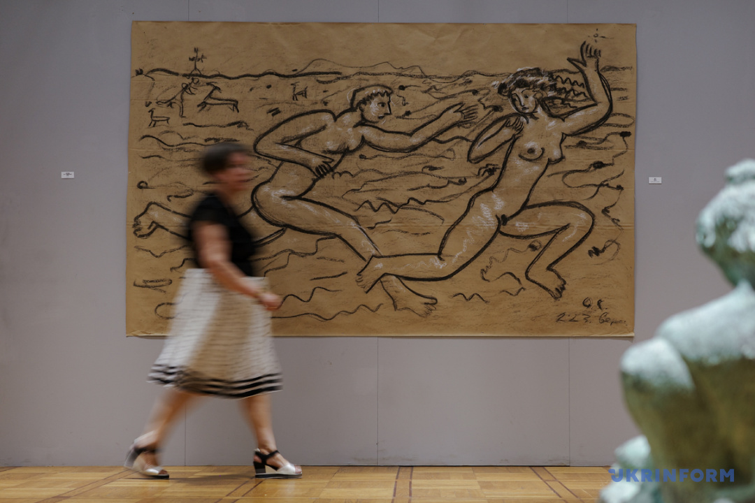 Жінка проходить повз експонат виставки "Олександр Сухоліт. Скульптура. Графіка. Малюнок. Живопис", присвяченої творчості художника, представника українського мистецтва кінця ХХ – початку ХХІ ст. Олександра Сухоліта, під час відкриття у головній будівлі Національного музею імені Андрея Шептицького у Львові, 19 липня 2024 року.