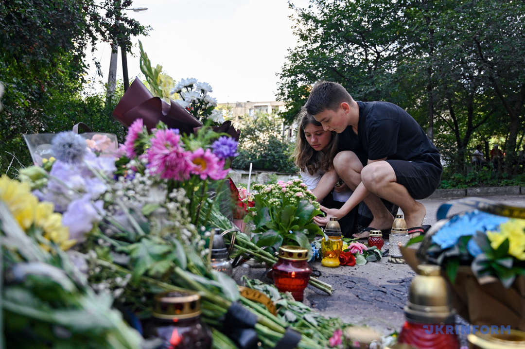 Небайдужі містяни запалюють лампадку біля символічного меморіалу, створеного на місці, де було скоєно замах на мовознавицю Ірину Фаріон, яка згодом померла у лікарні, Львів, 20 липня 2024 року.