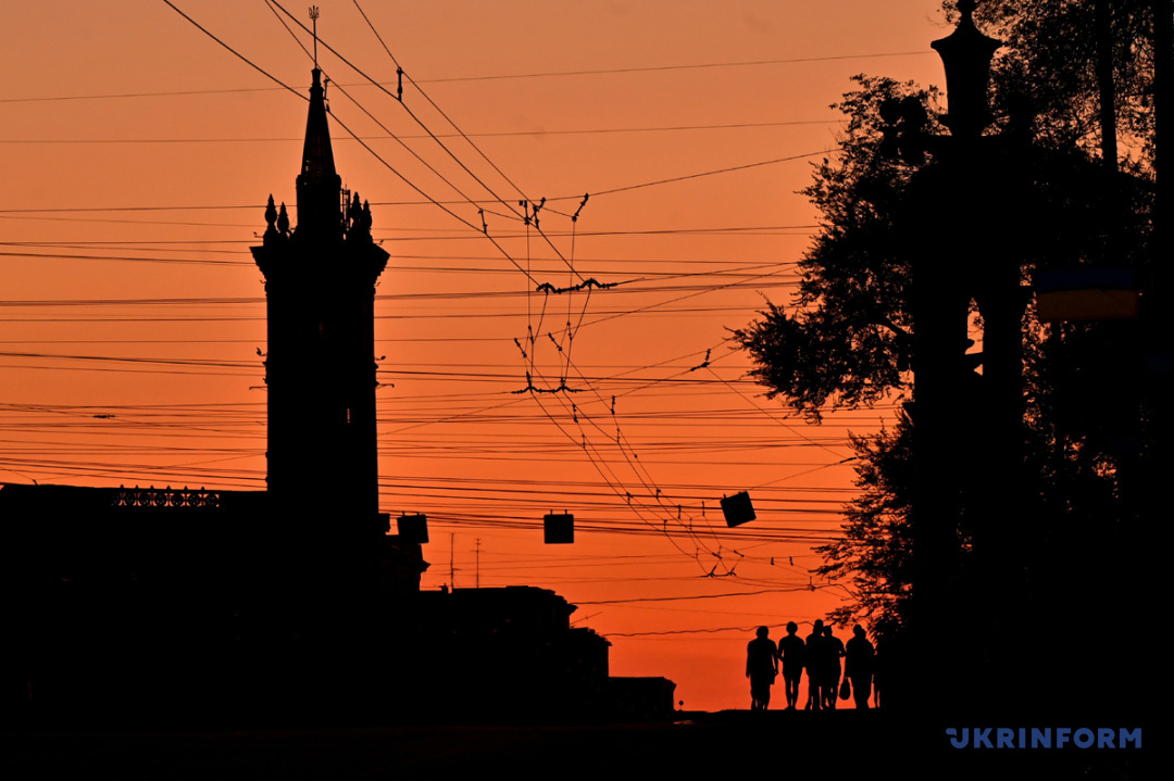 Силуети людей під час заходу сонця у Запоріжжі, де припинили вмикати вуличне освітлення через дефіцит електроенергії в регіоні, 20 липня 2024 року.