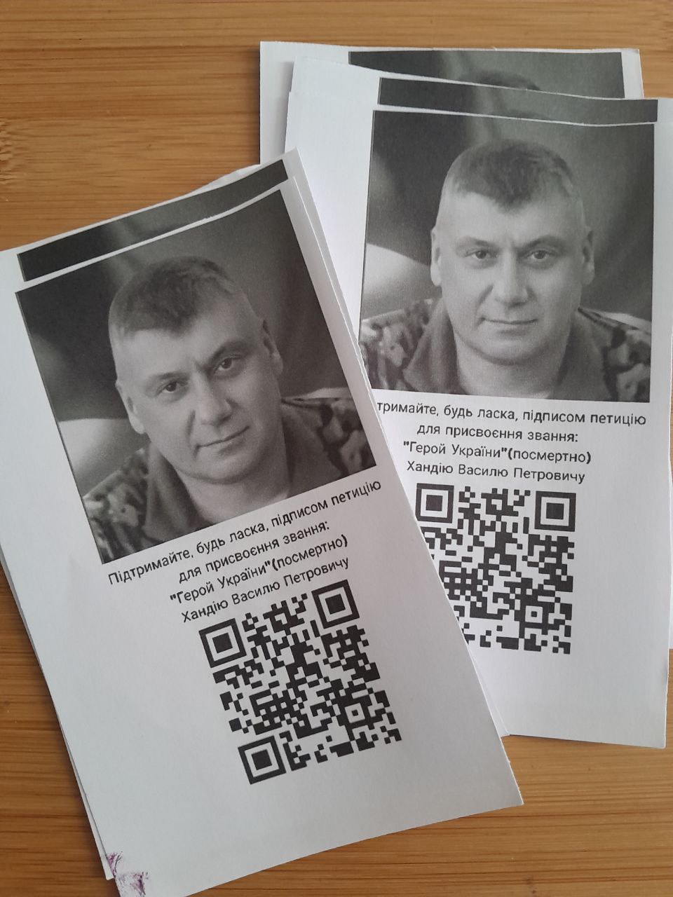 «Надвечірʼя. Перон  станції метро «Хрещатик» як завжди велелюдний. Як завжди переважна більшість пасажирів заглиблена у свої смартфони. Я не виключення…. Раптом на екран мого смартфону лягає якийсь папірець. На ньому фото військового та QR-код. Підіймаю очі – переді мною молода  жінка. Дещо збуджена. «Візьміть! Проголосуйте, будь ласка…» і протягує папірець, яких у неї цілий стос. У відповідь на мій розгублений погляд вибачається, що потурбувала, але не відступає: «Ми  збираємо підписи під петицією, будь ласка, зайдіть за кодом, це просто. Проголосуйте».  З надією дивиться мені в очі, швидко обертається і йде до інших пасажирів. Я спантеличено розглядаю на фото усміхненого чоловіка. Тут же включаю пошук і таки-так. Василь Хандій. Петиція для присвоєння звання Героя України посмертно… Тим часом потяг, в який я мала сідати, вже зачиняє двері, відходить. Незнайомиця одиноко залишається стояти на пероні, щось розглядаючи в своєму телефоні.