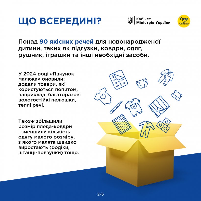Замість Пакунка малюка можна отримати грошову компенсацію його вартості. У 2024 році розмір грошової компенсації на одну дитину становить 7 689 грн.