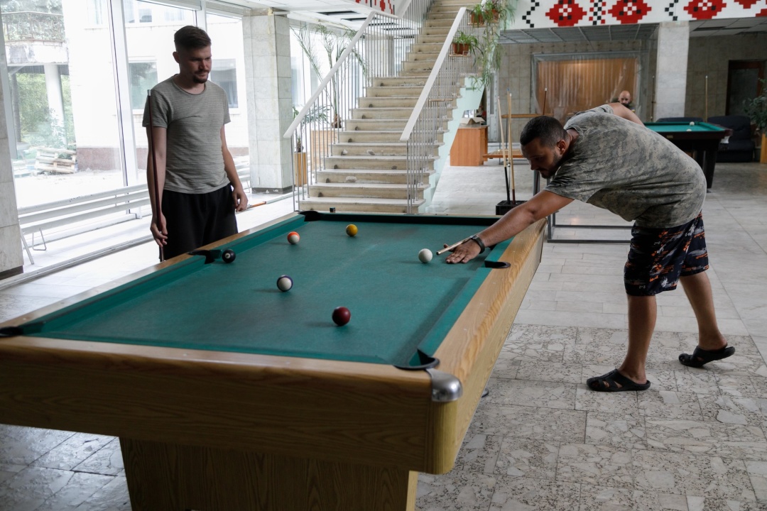 Спілкуємося з тими, хто у «Лісовій поляні» проходить курс реабілітації. Ось двоє молодих людей, які грають на більярді. «Центр дуже класний. Дуже гарне ставлення до військовослужбовців і всіх інших. Лікарі дуже круті, чуйні», – каже Олександр Бельковський з Києва, який на фронті служив медиком, а перебуває у «Лісовій поляні», як і всі – 21 день. Співрозмовник виділив, що у закладі дуже багато корисних пропозицій для тих, в кого є проблеми з опорно-руховою системою.
