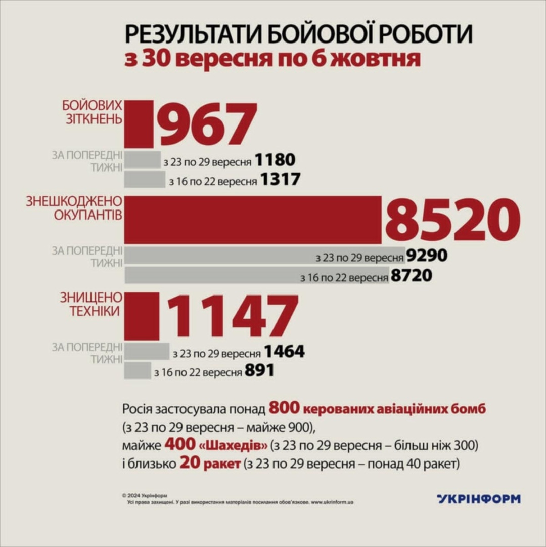 З 30.09 по 6.10 на Харківському напрямку ворог збільшив активність, Сили оборони України стримують натиск росіян. У Вовчанську противник з посилив штурмові групи, фіксується прибуття особового складу у підрозділи управління БпЛА та артилерійські підрозділи.