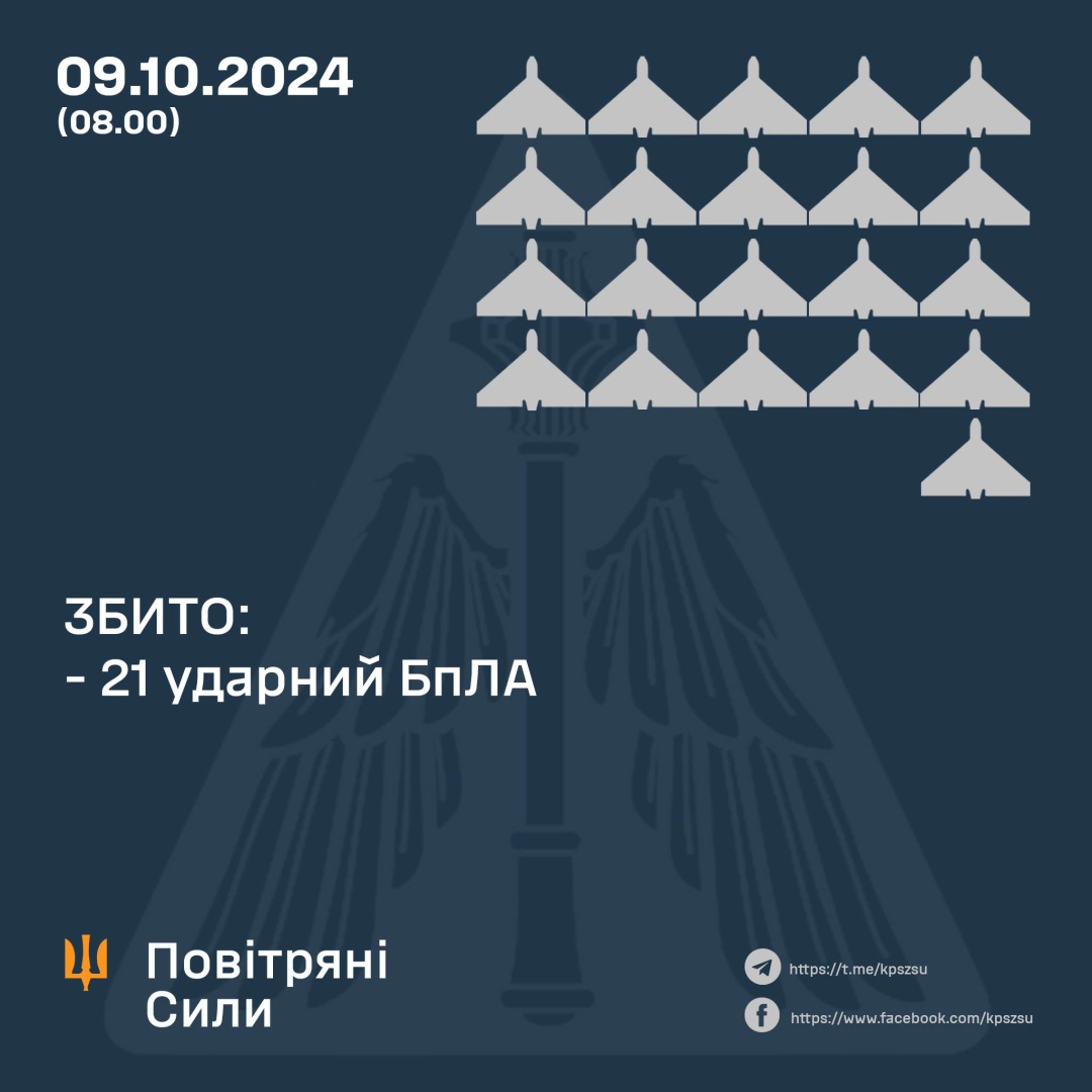 В результаті протиповітряного бою збито 21 ворожий БпЛА в Одеській, Вінницькій та Київській областях. Ще один ударний безпілотник повернув у напрямку Росії.