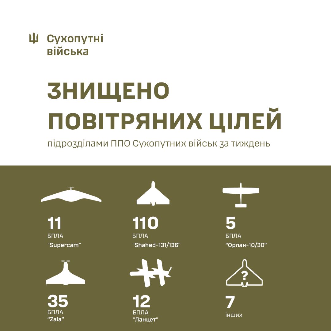 "ППО Сухопутних військ за минулий тиждень знищила 180 засобів повітряної розвідки та нападу противника", – ідеться у повідомленні.
