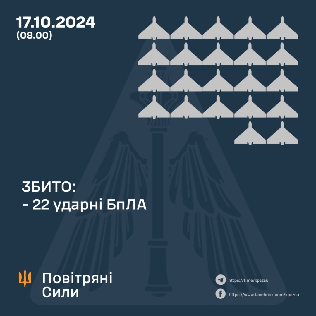 Сили оборони України збили 22 безпілотники, якими російські загарбники з вечора 16 жовтня атакували Україну.