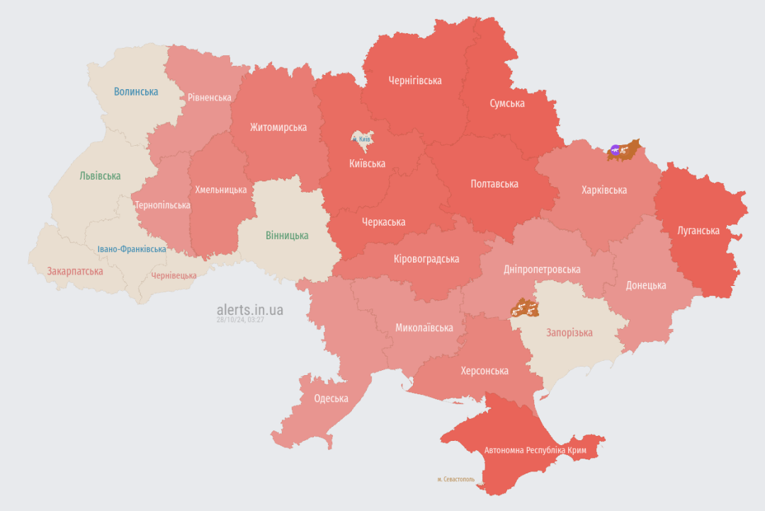 02:20 – кількість "Шахедів" у повітряному просторі України збільшилася: "Нова група "шахедів" з Сумської області на Чернігівщину. група "шахедів" в Чернігівській, Київській, Житомирській та Полтавській областях курсом на захід. на сході Хмельниччини курсом на Старо Костянтинів. на півночі Кіровоградщини курсом на Черкащину. на півночі Херсонщини курсом на південний захід".