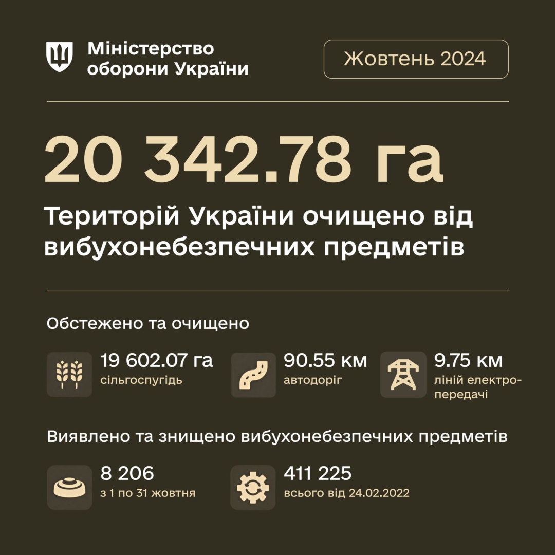 «Протягом жовтня 2024 року підрозділи з розмінування Міністерства оборони України очистили 20 342,78 га територій, забруднених вибухонебезпечними предметами внаслідок збройної агресії РФ», – йдеться в повідомленні.