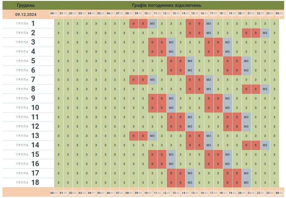 У графіку погодинних відключень відображають години гарантованого включення електроенергії (зелені клітинки) та години, коли ваші оселі будуть точно знеструмлені (позначені червоним кольором).