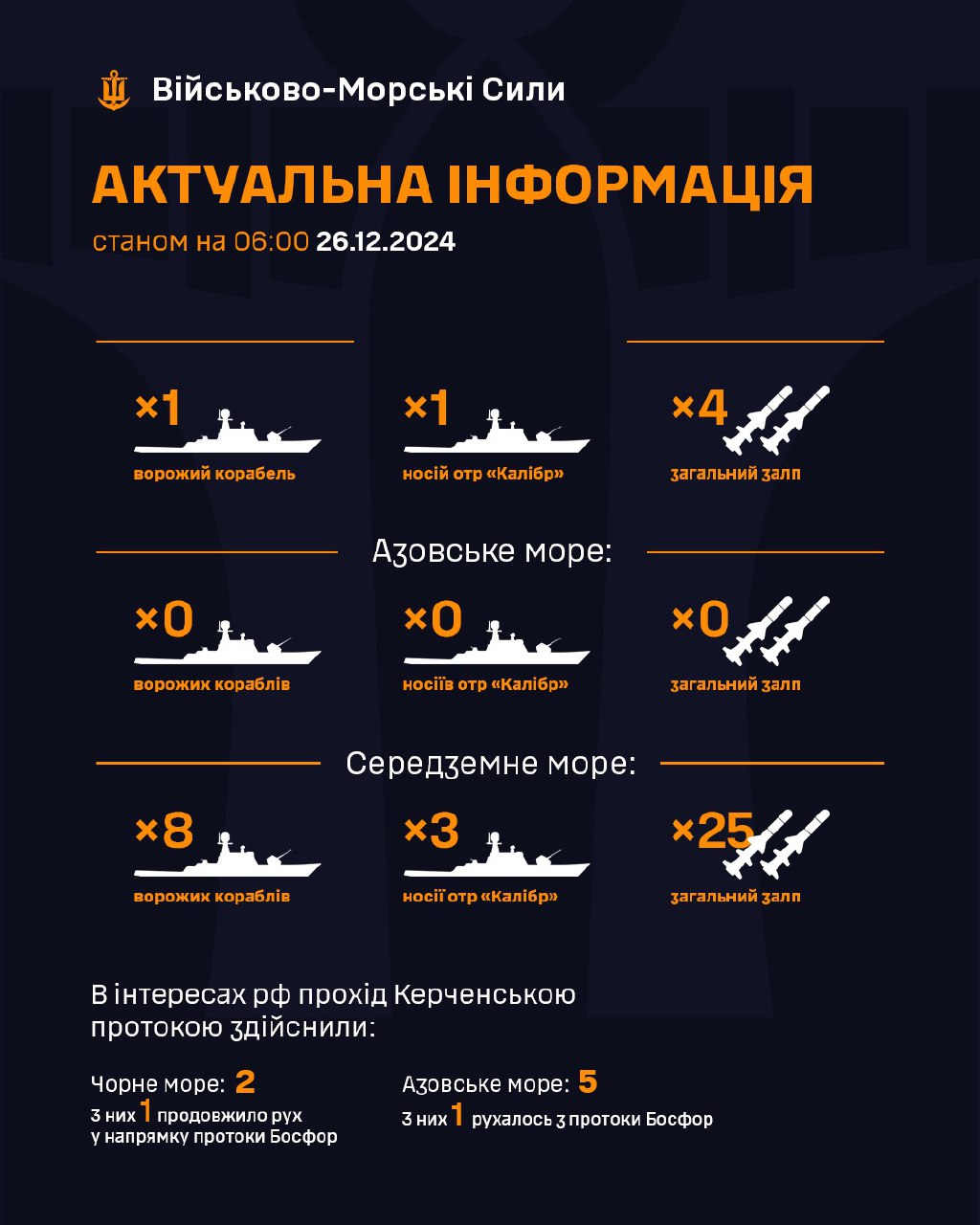 Станом на 6:00 26 грудня у Чорному морі перебуває один ворожий ракетоносій загальним залпом до чотирьох крилатих ракет "Калібр".