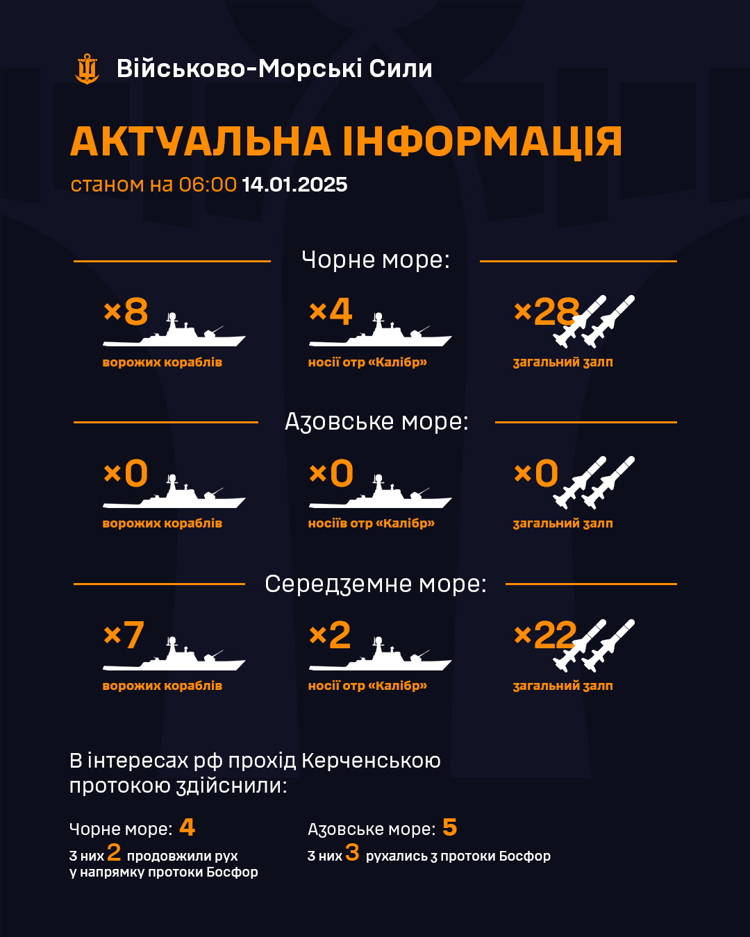 Росія станом на 06:00 вівторка, 14 січня, тримає у Чорному морі 8 кораблів, з яких 4 є носіями крилатих ракет "Калібр" загальним залпом до 28 ракет.