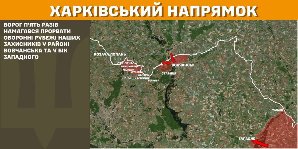 На Харківському напрямку ворог п’ять разів намагався прорвати оборонні рубежі українських захисників у районі Вовчанська та у бік Западного.