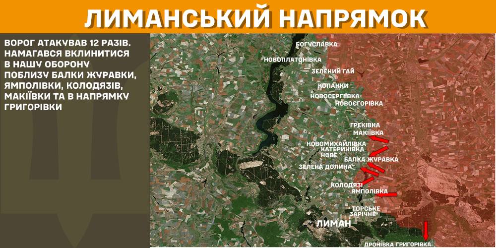 На Лиманському напрямку ворог атакував 12 разів. Намагався вклинитися в українську оборону поблизу Балки Журавки, Ямполівки, Колодязів, Макіївки та в напрямку Григорівки.