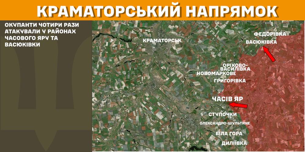 На Краматорському напрямку загарбники чотири рази атакували у районах Часового Яру та Васюківки.
