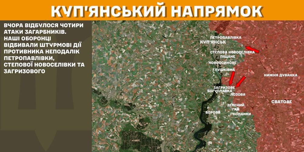 На Куп’янському напрямку вчора відбулося чотири атаки загарбників. Українські оборонці відбивали штурмові дії ворога неподалік Петропавлівки, Степової Новоселівки та Загризового.