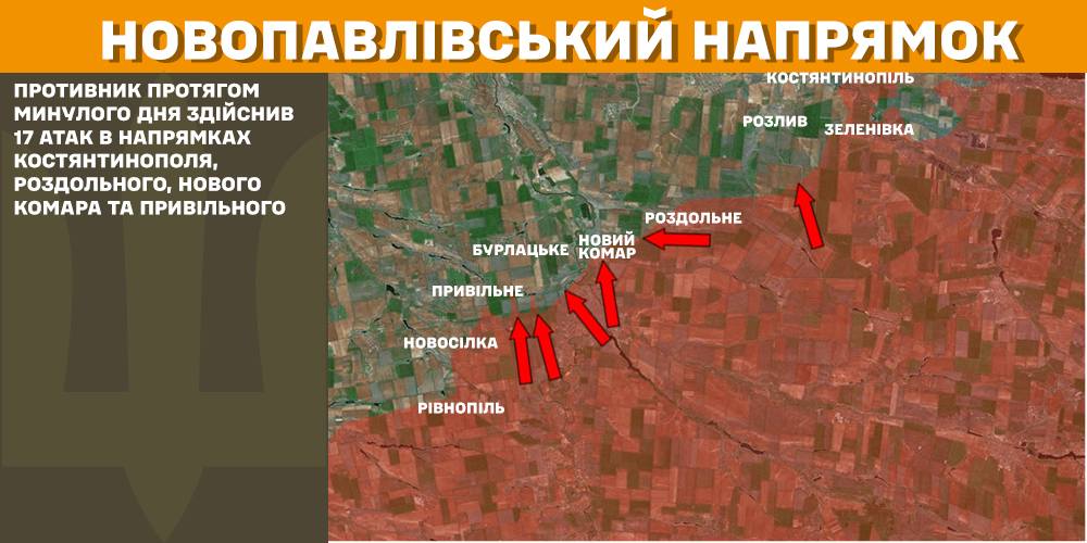 На Новопавлівському напрямку ворог протягом минулого дня здійснив 17 атак в напрямках Костянтинополя, Роздольного, Нового Комара та Привільного.
