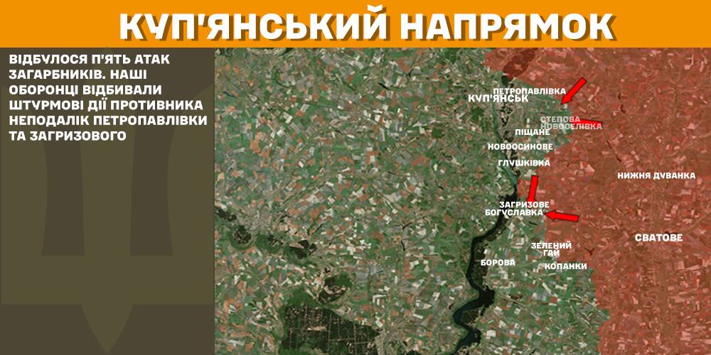 На Куп’янському напрямку вчора відбулося п’ять атак загарбників. Сили оборони відбивали штурмові дії ворога неподалік Петропавлівки та Загризового.