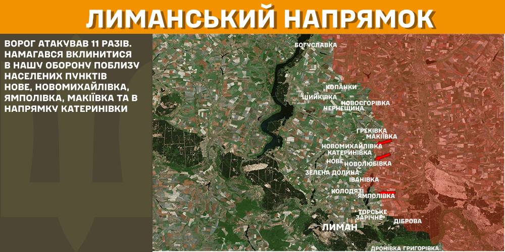 На Лиманському напрямку ворог атакував 11 разів. Намагався вклинитися в українську оборону поблизу населених пунктів Нове, Новомихайлівка, Ямполівка, Макіївка та в напрямку Катеринівки.