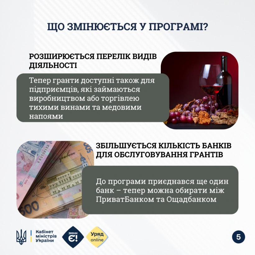 Зокрема, з 2025 року гранти доступні для підприємців, які займаються виробництвом вин, а також збільшено кількість банків.