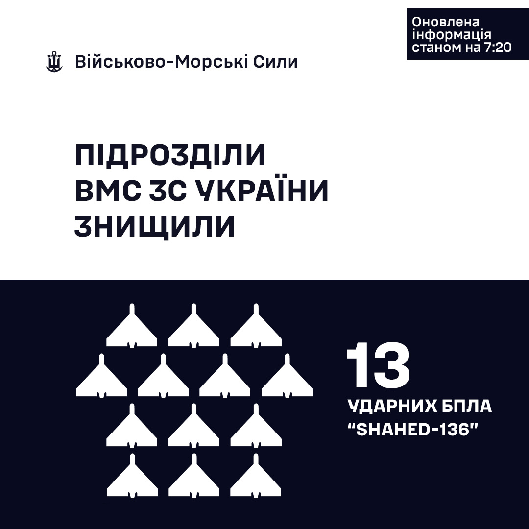 "Сьогодні вночі під час повітряної атаки російських окупантів силами та засобами Військово-Морських Сил Збройних Сил України в Одеській та Донецькій областях було збито 13 ударних БПЛА типу "Shahed-136", – поінформували у ВМС.