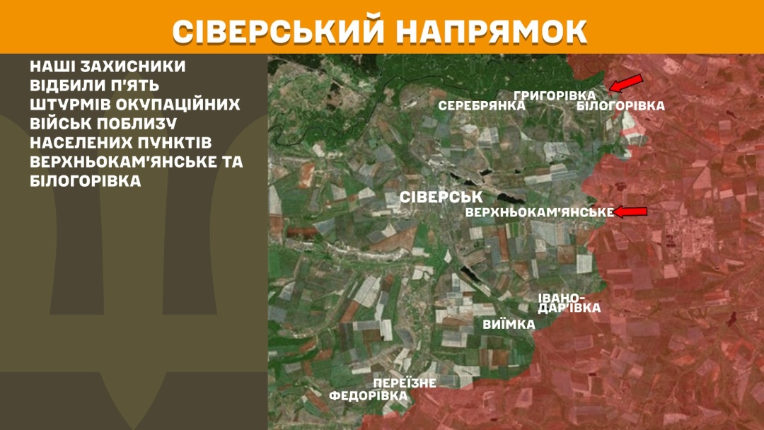 На Сіверському напрямку наші захисники відбили п’ять штурмів окупаційних військ поблизу населених пунктів Верхньокам’янське та Білогорівка.
