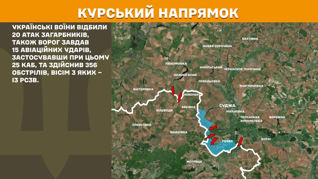 У Курській області минулої доби українські воїни відбили 20 атак загарбників, також ворог завдав 15 авіаційних ударів, застосувавши при цьому 25 КАБ, та здійснив 356 обстрілів, вісім з яких – із РСЗВ.