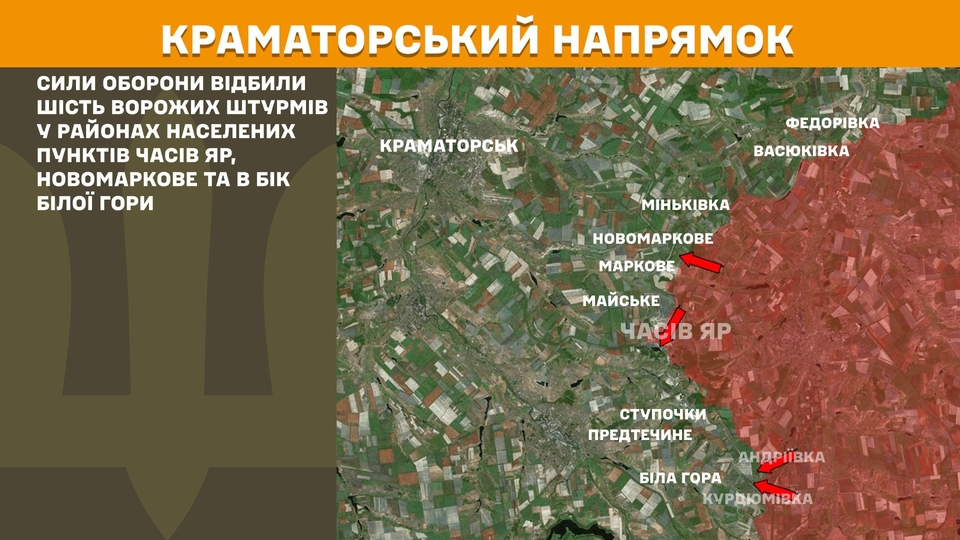 На Краматорському напрямку Сили оборони відбили шість ворожих штурмів у районах Часового Яру, Новомаркового та в бік Білої Гори.