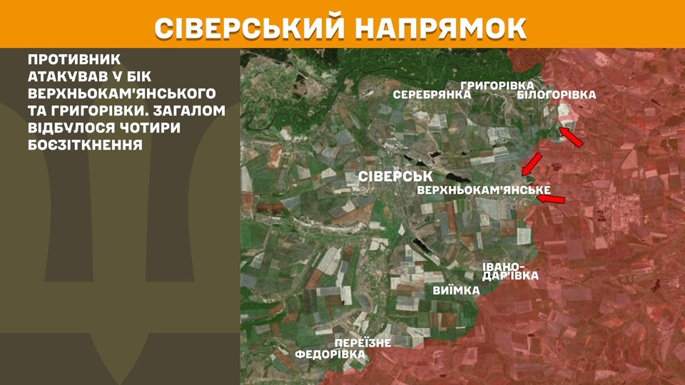 На Сіверському напрямку російські війська атакували у бік Верхньокам’янського та Григорівки. Загалом минулої доби сталися чотири боєзіткнення.