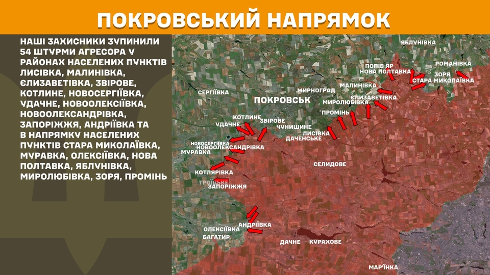 На Покровському напрямку українські захисники зупинили 54 штурми росіян у районах населених пунктів Лисівка, Малинівка, Єлизаветівка, Звірове, Котлине, Новосергіївка, Удачне, Новоолексіївка, Новоолександрівка, Запоріжжя, Андріївка та в напрямку населених пунктів Стара Миколаївка, Муравка, Олексіївка, Нова Полтавка, Яблунівка, Миролюбівка, Зоря, Промінь.