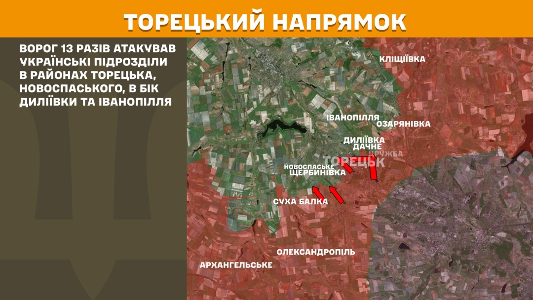 На Торецькому напрямку ворог 13 разів атакував українські підрозділи у районах Торецька, Новоспаського, в бік Диліївки та Іванопілля.