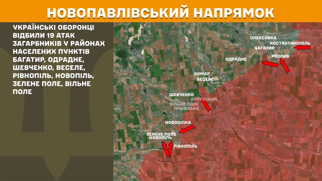 На Новопавлівському напрямку захисники України відбили 19 ворожих атак у районах Багатиря, Одрадного, Шевченка, Веселого, Рівнополя, Новополя, Зеленого Поля та Вільного Поля.