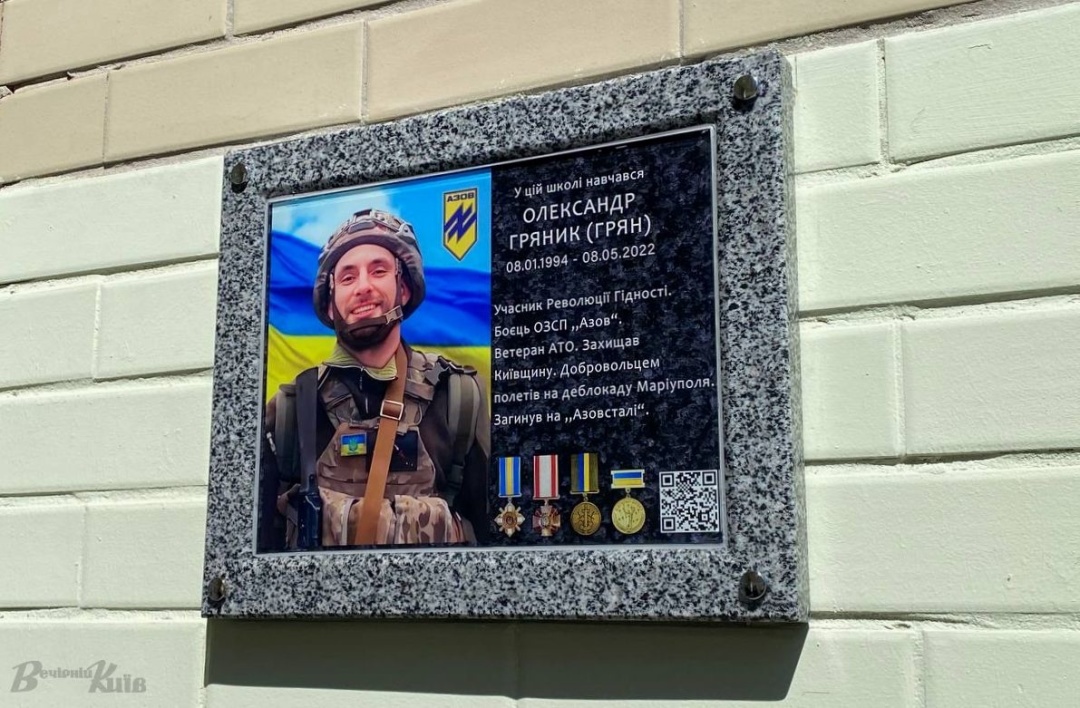 У травні 2024 року батьки захисника разом з представниками місцевої влади та викладачами встановили меморіальну дошку біля центрального входу школи №298 у Києві, в якій навчався Олександр Гряник.