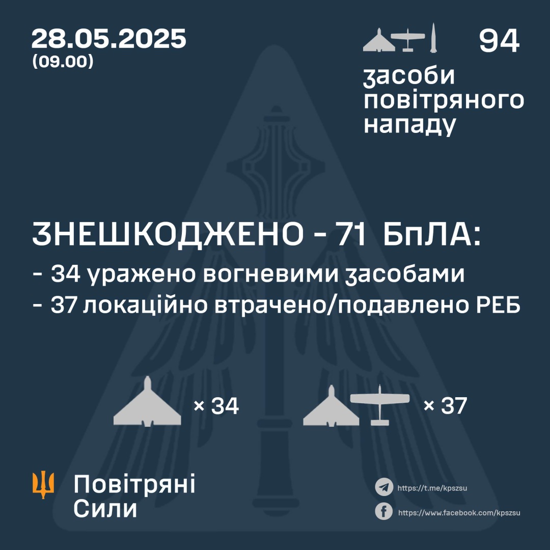 Сили протиповітряної оборони знешкодили 71 із 88 російських безпілотників, якими росіяни з вечора 27 травня атакували Україну.