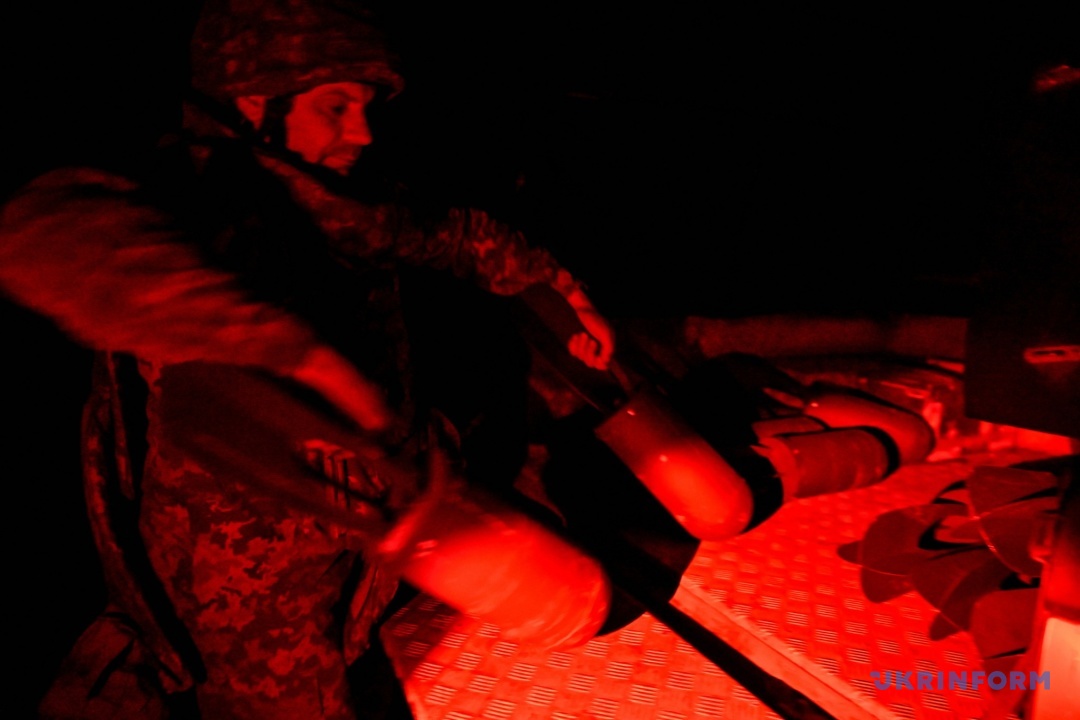 Із посадки виходять дві тіні із червоними ліхтариками. Швидко, без привітань починають вивантажувати БК. Я прошу не поспішати, щоб сфотографувати вивантаження. Але один із них вказує мені на відомий усім маршрут. Після цього ми з пресофіцером спускаємось до бліндажа, де за хвилину опиняється й увесь екіпаж.