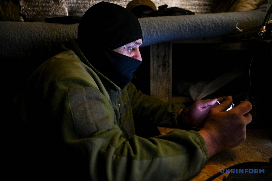 Із посадки виходять дві тіні із червоними ліхтариками. Швидко, без привітань починають вивантажувати БК. Я прошу не поспішати, щоб сфотографувати вивантаження. Але один із них вказує мені на відомий усім маршрут. Після цього ми з пресофіцером спускаємось до бліндажа, де за хвилину опиняється й увесь екіпаж.