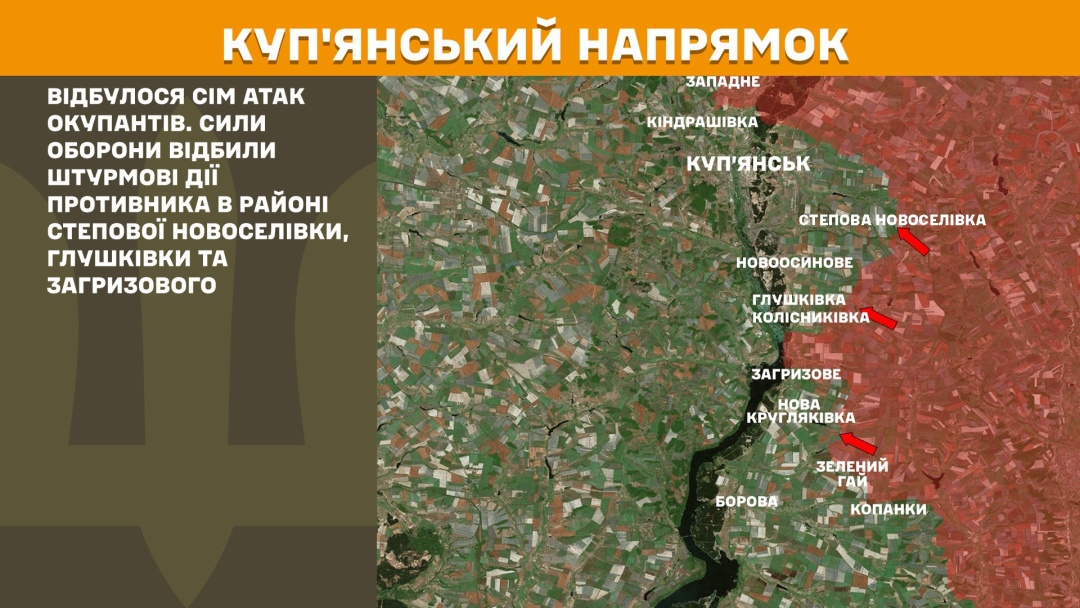На Куп’янському напрямку відбулося сім атак окупантів. Сили оборони відбили штурмові дії противника в районі Степової Новоселівки, Глушківки та Загризового.