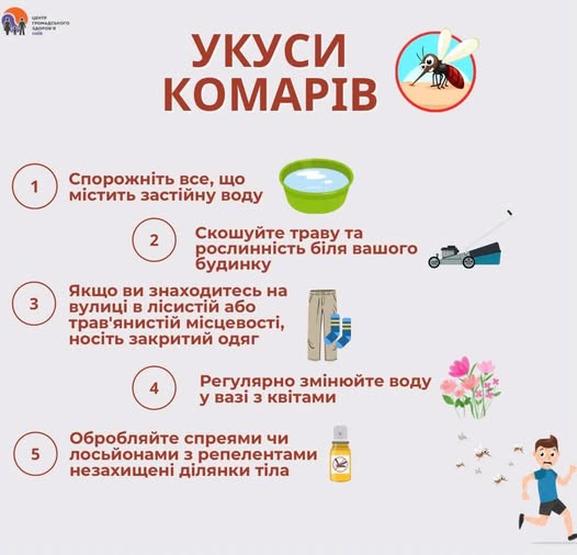 • Якщо ви знаходитесь на вулиці в лісистій або трав’янистій місцевості, носіть закритий одяг (бажано світлий), а незахищені ділянки обробіть спреями чи лосьйонами з репелентами, носіть антикомарні браслети.