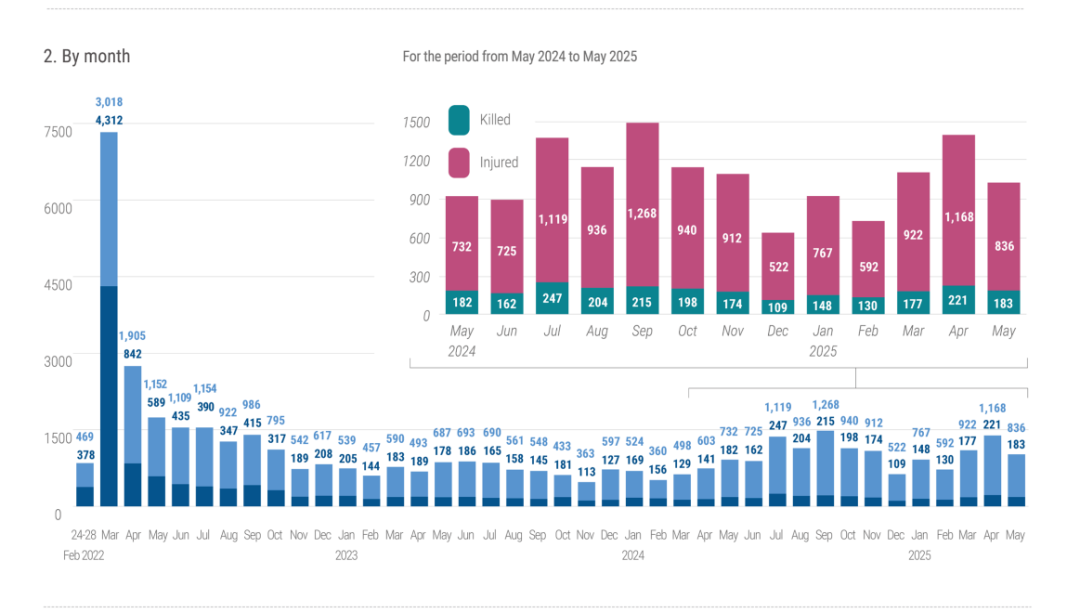 У травні в Україні внаслідок російських атак загинули щонайменше 183 цивільні особи та 836 отримали поранення.