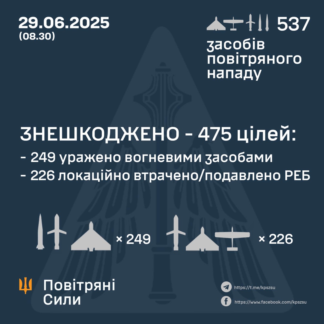 У ніч на 29 червня (із 19.00 28 червня) ворог атакував 537 засобами повітряного нападу: