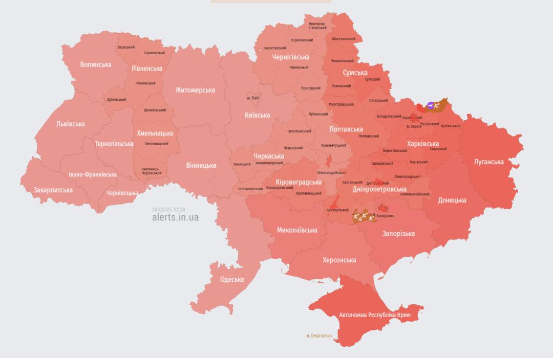 Актуальна мапа повітряних тривог станом на 02:28 / Джерело: https://alerts.in.ua/