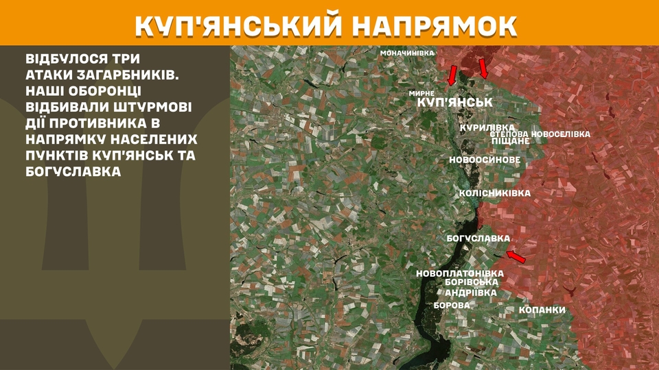 На Куп’янському напрямку відбулося три атаки російських загарбників. Сили оборони відбивали штурмові дії ворога в напрямку Куп’янська та Богуславки.