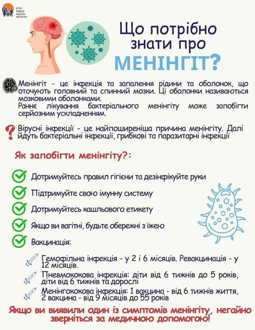 #Менінгіт – це інфекція та запалення рідини та оболонок, що оточують головний та спинний мозки. Ці оболонки називаються мозковими оболонками. Якщо ви запідозрили симптоми менінгіту (висока t°C, сильний головний біль, блювота, ригідність м’язів) негайно зверніться за медичною допомогою. Раннє лікування бактеріального менінгіту може запобігти серйозним ускладненням.