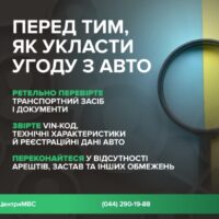 Перш ніж погоджуватись на будь-яку угоду, необхідно ретельно перевірити транспортний засіб і документи. Варто звірити VIN-код, технічні характеристики та реєстраційні дані авто, переконатися у відсутності арештів, застав або інших обмежень. Достовірність усіх документів слід перевіряти виключно через офіційні джерела ГСЦ МВС.