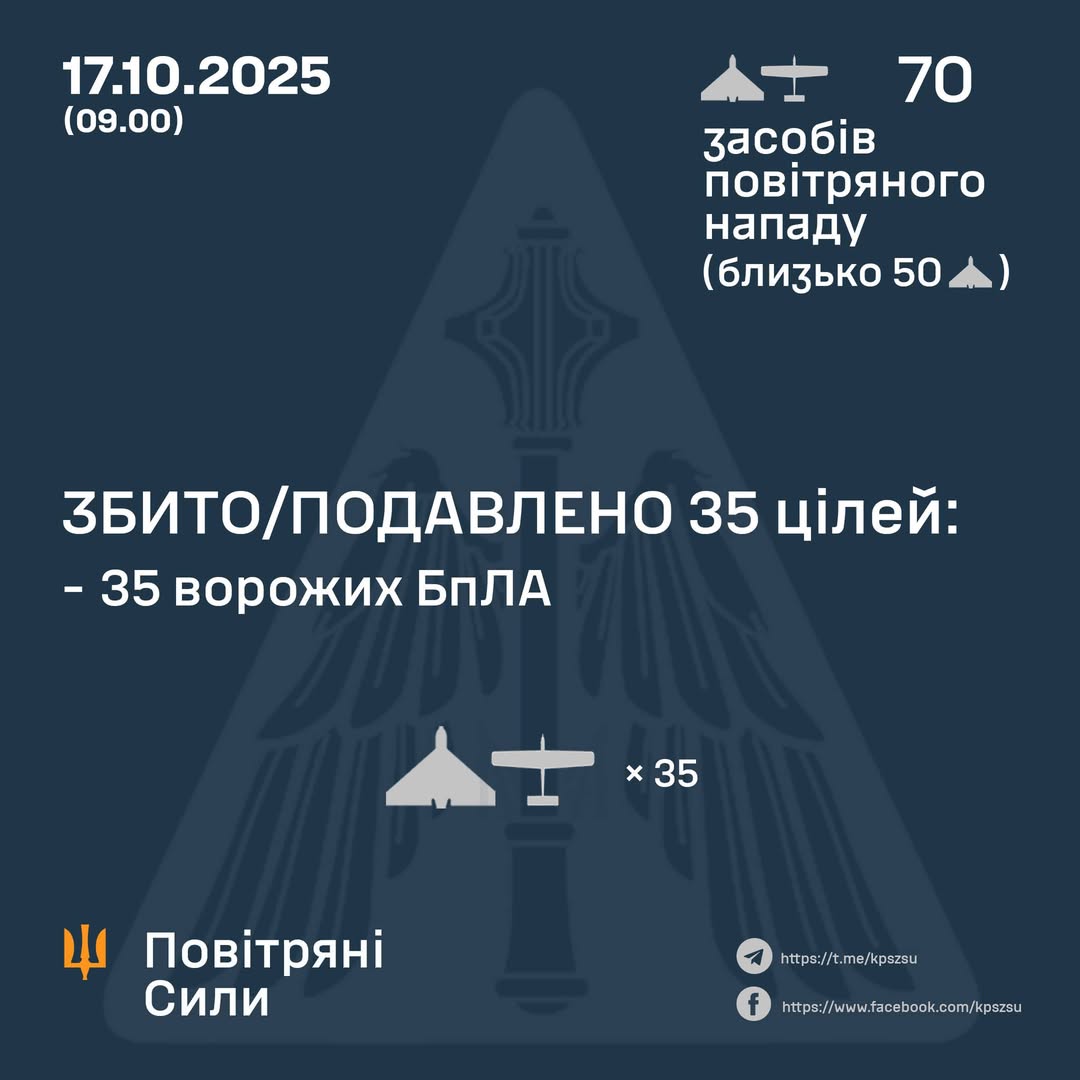 Сили протиповітряної оборони знешкодили 35 російських безпілотників із 70 запущених з вечора 16 жовтня.